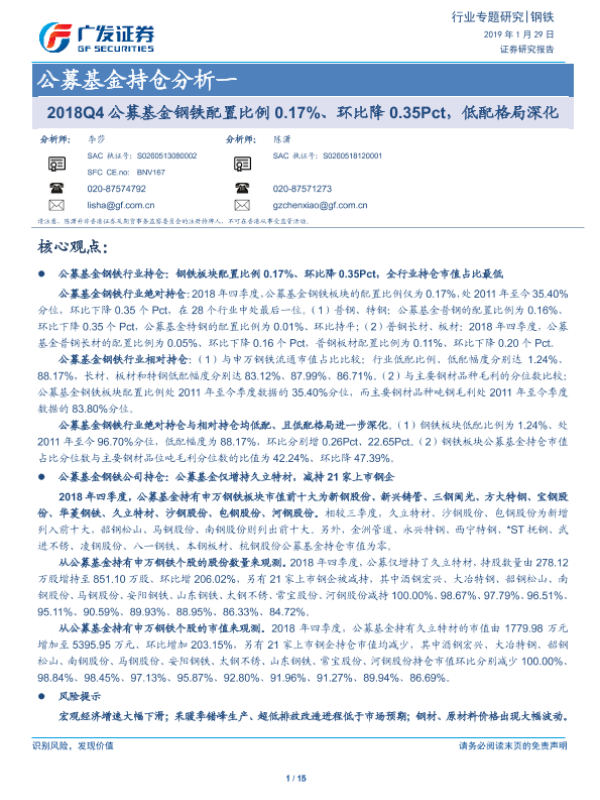 【广发证券】【20190129】20190129-广发证券-钢铁行业专题研究:公募基金持仓分析一:2018Q4公募基金钢铁配置比例0.17%、环比降0.35Pct,低配格局深化-15页