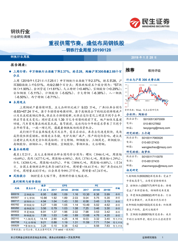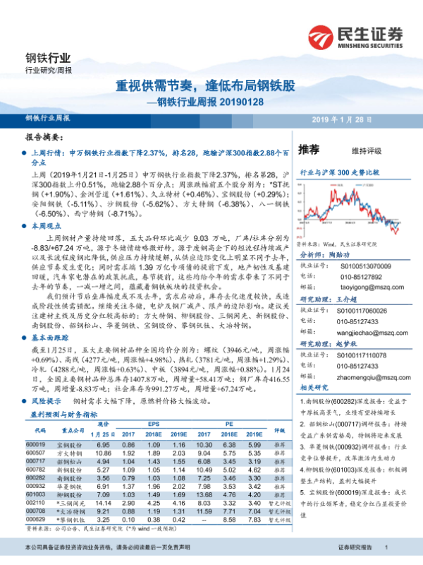 【民生证券】【20190128】20190128-民生证券-钢铁行业周报:重视供需节奏,逢低布局钢铁股-29页