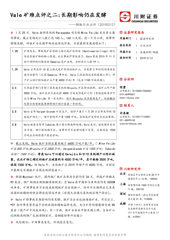 【川财证券】【20190212】20190212-川财证券-钢铁行业点评:Vale矿难点评之二:长期影响仍在发酵-2页