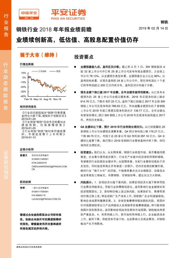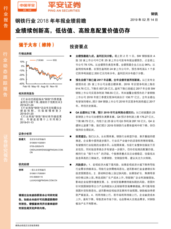 【平安证券】【20190214】钢铁行业2018年年报业绩前瞻:业绩续创新高,低估值、高股息配置价值仍存-9页
