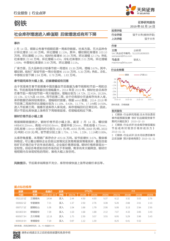 【天风证券】【20190214】钢铁行业点评:社会库存增速进入峰值期 后续增速或有所下降-2页