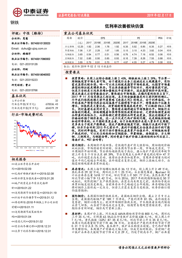 【中泰证券】【20190217】中泰证券-钢铁行业周报:低利率改善板块估值-15页