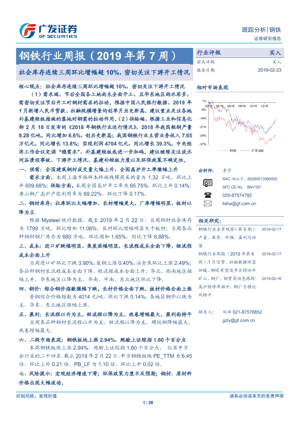 【广发证券】【20190223】2019年第7周钢铁行业周报:社会库存连续三周环比增幅超10%,密切关注下游开工情况-26页
