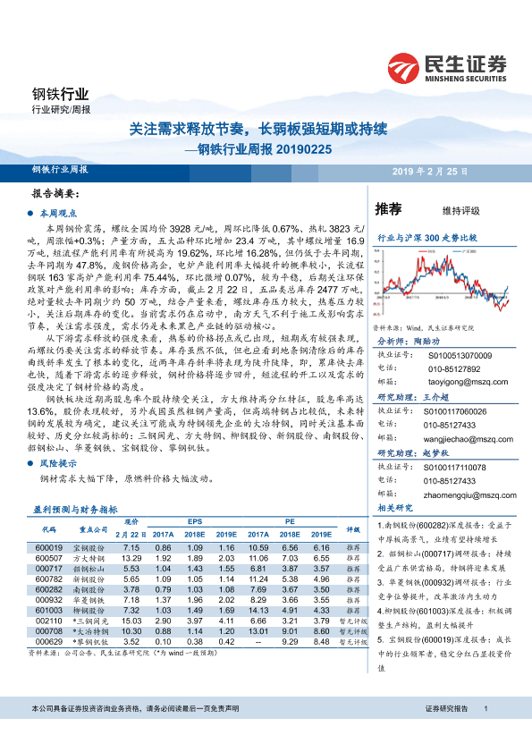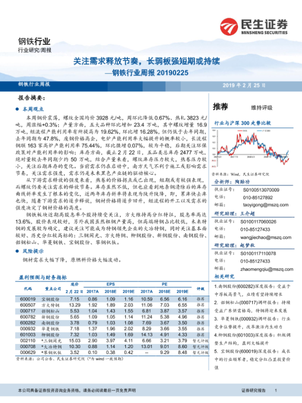 【民生证券】【20190225】20190225-民生证券-钢铁行业周报:关注需求释放节奏,长弱板强短期或持续-30页
