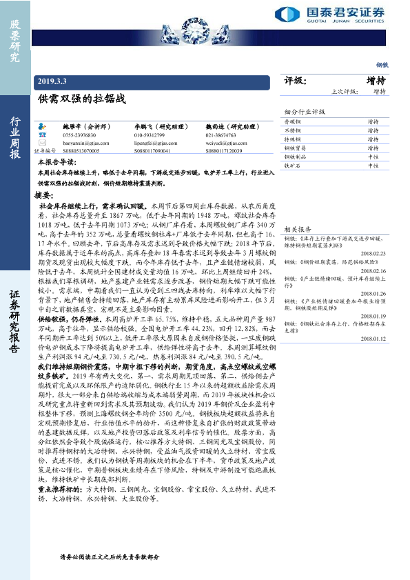 【国泰君安证券】【20190303】20190303-国泰君安-钢铁行业周报:供需双强的拉锯战-22页