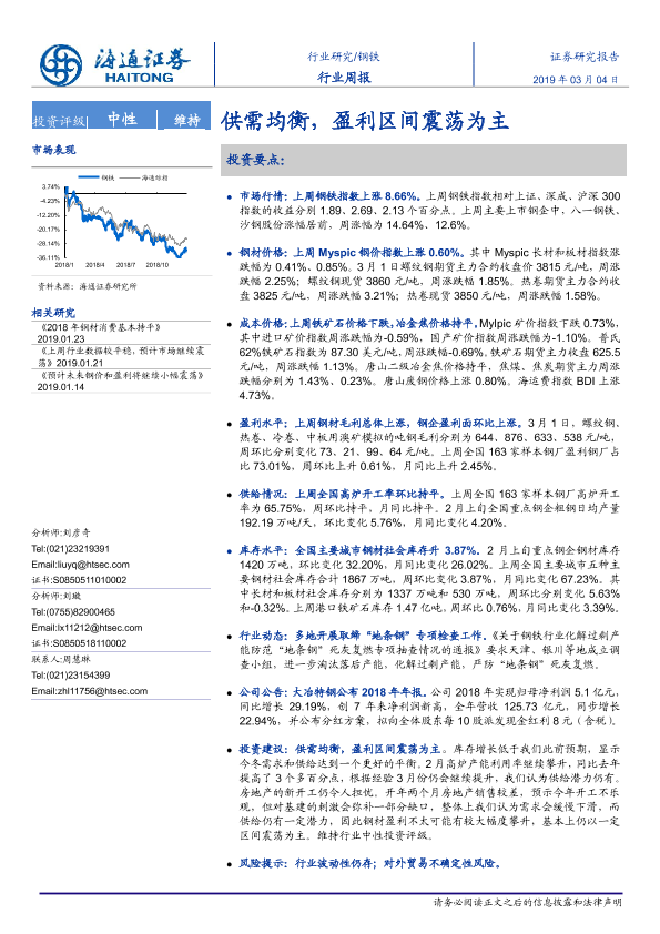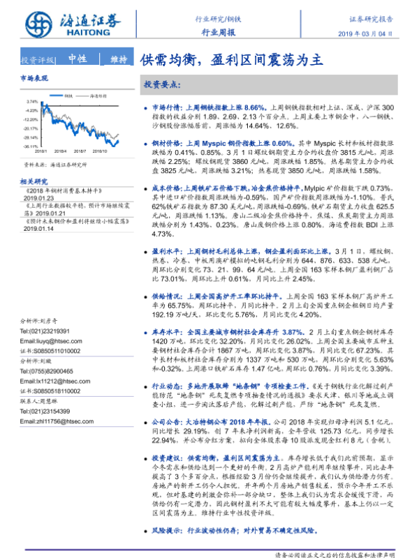 【海通证券】【20190304】20190304-海通证券-钢铁行业周报:供需均衡,盈利区间震荡为主-18页