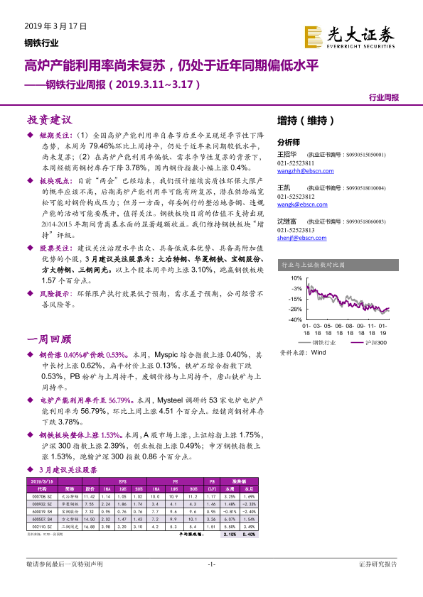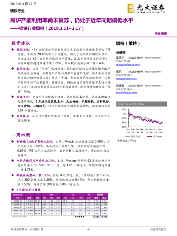 【光大证券】【20190317】光大证券-钢铁行业周报:高炉产能利用率尚未复苏,仍处于近年同期偏低水平-10页