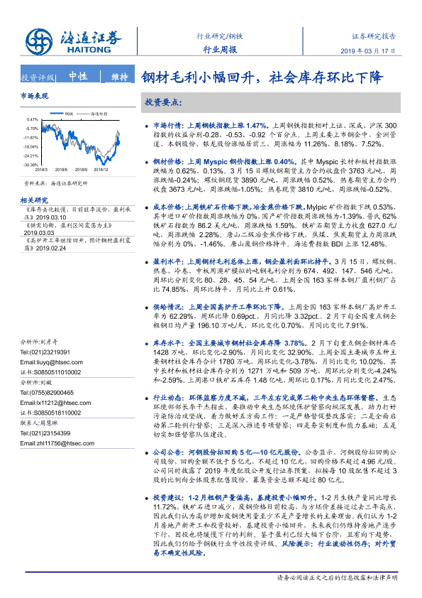 【海通证券】【20190317】20190317-海通证券-钢铁行业周报:钢材毛利小幅回升,社会库存环比下降-14页