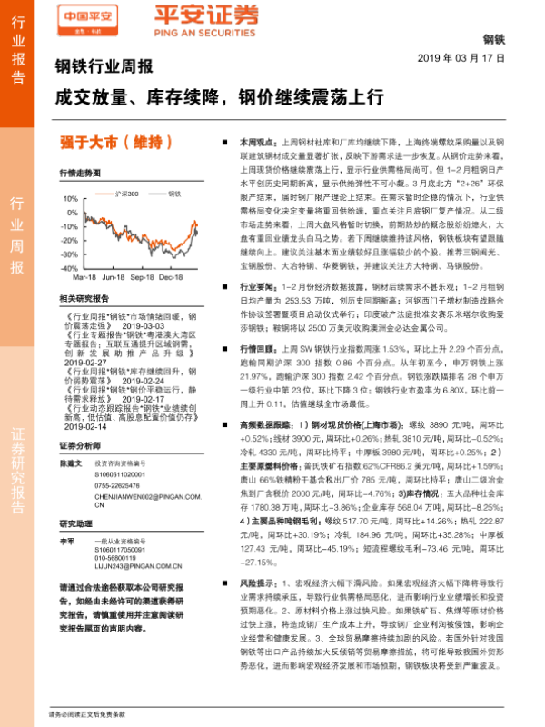 【平安证券】【20190317】钢铁行业周报:成交放量、库存续降,钢价继续震荡上行-6页