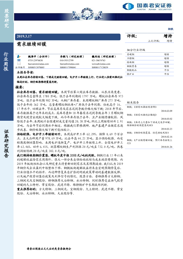 【国泰君安证券】【20190317】20190317-国泰君安-钢铁行业周报:需求继续回暖-22页