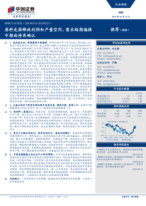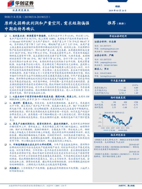 【华创证券】【20190324】20190324-华创证券-钢铁行业周报:原料走弱释放利润和产量空间,需求短期偏强中期尚待再确认-25页