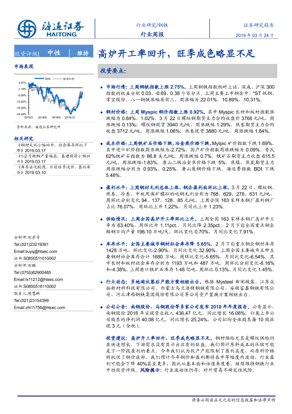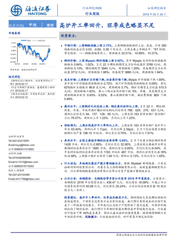 【海通证券】【20190324】20190324-海通证券-钢铁行业周报:高炉开工率回升,旺季成色略显不足-15页