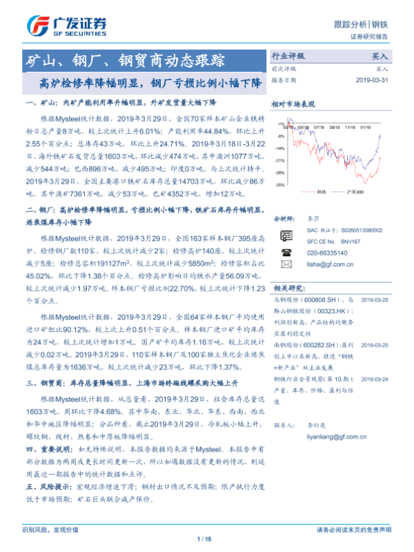 【广发证券】【20190331】20190331-广发证券-矿山、钢厂、钢贸商动态跟踪:高炉检修率降幅明显,钢厂亏损比例小幅下降-15页