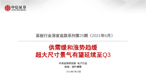 【中信证券】【20210719】面板行业深度追踪系列第25期(2021年6月):供需缓和涨势趋缓,超大尺寸景气有望延续至Q3-22页