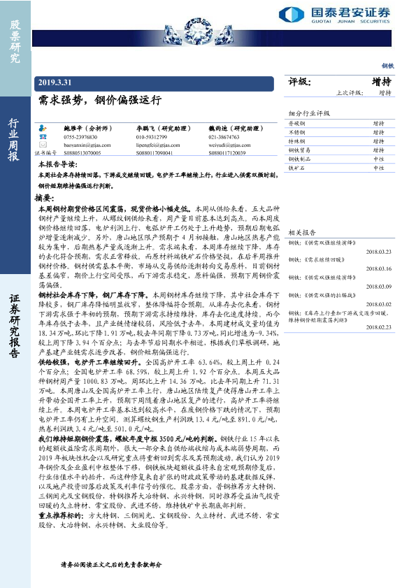 【国泰君安证券】【20190331】20190331-国泰君安-钢铁行业周报:需求强势,钢价偏强运行-22页