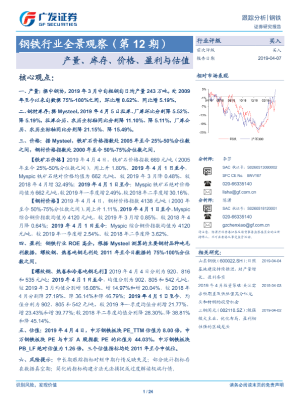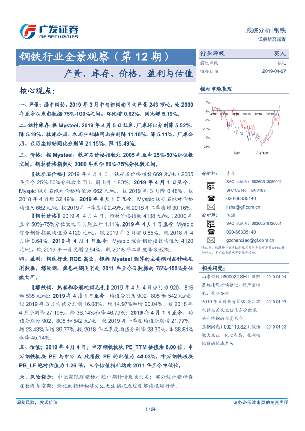 【广发证券】【20190407】20190407-广发证券-钢铁行业全景观察(第12期):产量、库存、价格、盈利与估值-24页