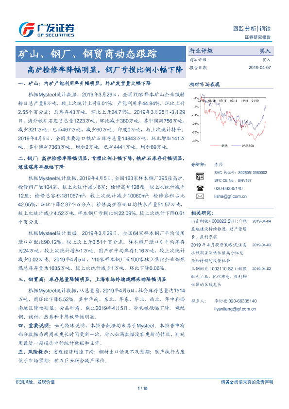 【广发证券】【20190407】20190407-广发证券-矿山、钢厂、钢贸商动态跟踪:高炉检修率降幅明显,钢厂亏损比例小幅下降-15页