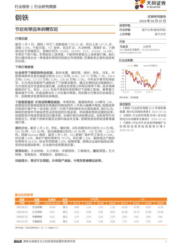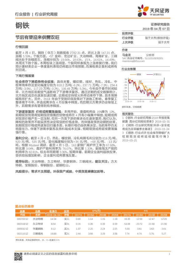 【天风证券】【20190407】20190407-天风证券-钢铁行业研究周报:节后有望迎来供需双旺-13页