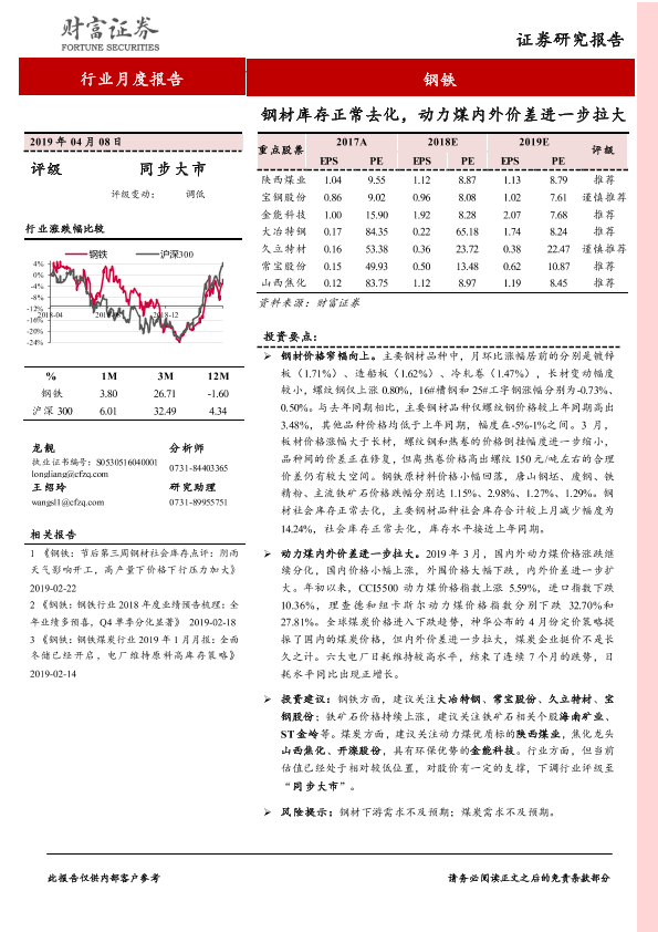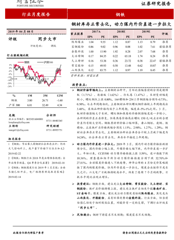 【财信证券】【20190408】20190408-财信证券-钢铁行业月度报告:钢材库存正常去化,动力煤内外价差进一步拉大-16页