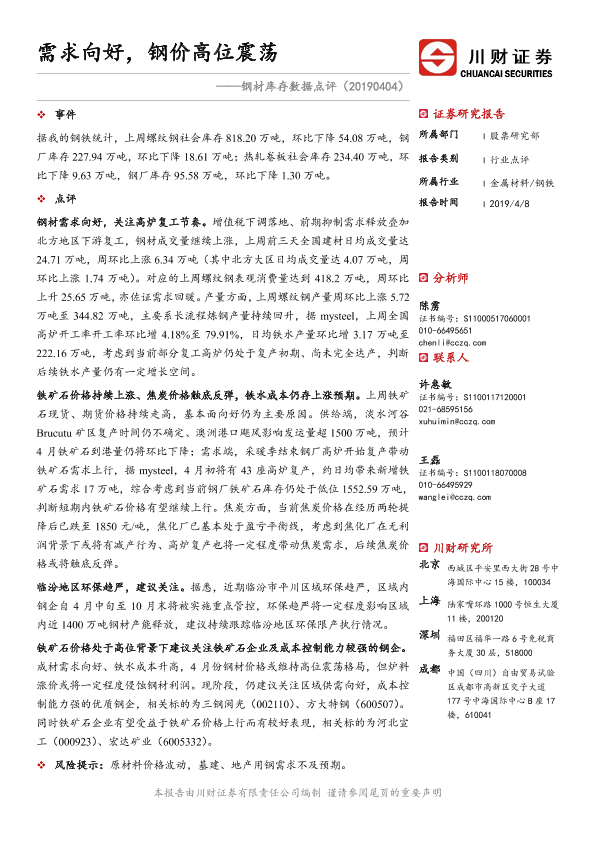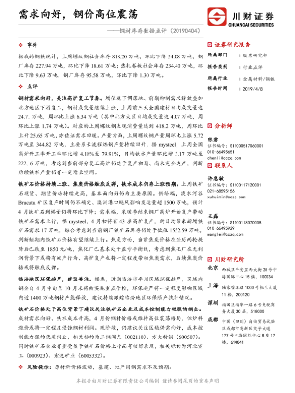 【川财证券】【20190408】钢材库存数据点评:需求向好,钢价高位震荡-2页