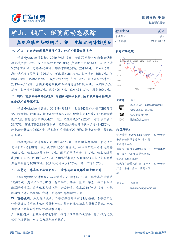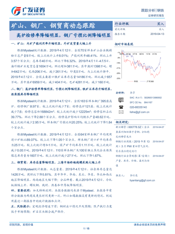 【广发证券】【20190413】20190413-广发证券-矿山、钢厂、钢贸商动态跟踪:高炉检修率降幅明显,钢厂亏损比例降幅明显-15页