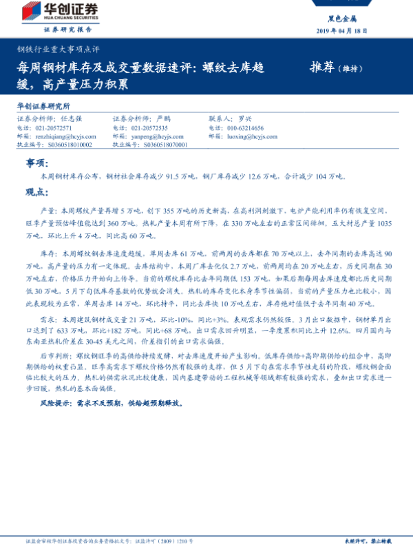 【华创证券】【20190418】每周钢材库存及成交量数据速评:螺纹去库趋缓,高产量压力积累-7页