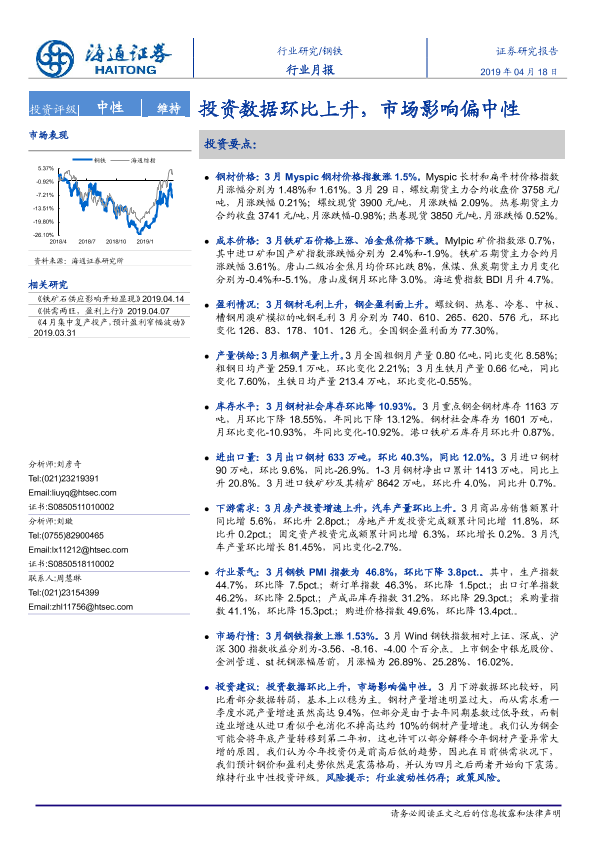 【海通证券】【20190418】20190418-海通证券-钢铁行业月报:投资数据环比上升,市场影响偏中性-17页