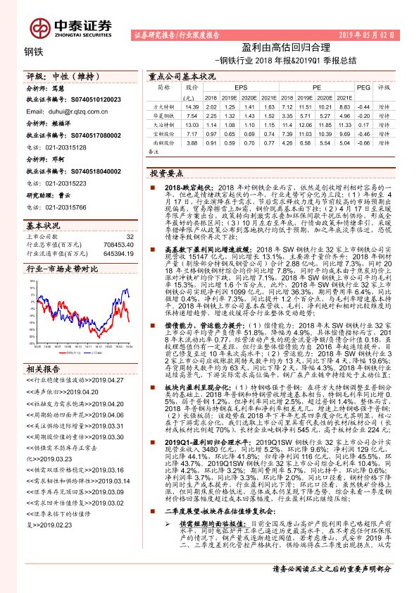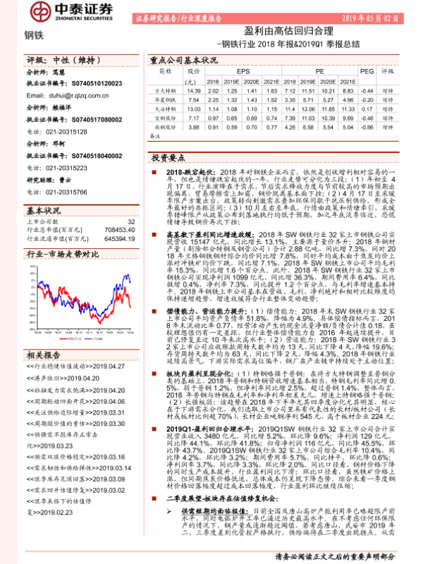 【中泰证券】【20190502】钢铁行业2018年报&2019Q1季报总结:盈利由高估回归合理-18页