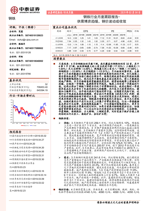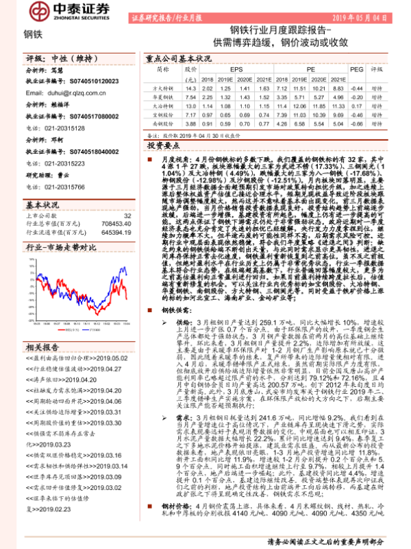 【中泰证券】【20190504】钢铁行业月度跟踪报告:供需博弈趋缓,钢价波动或收敛-20页