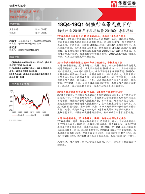 【华泰证券】【20190507】钢铁行业2018年年报总结暨2019Q1季报总结:18Q4-19Q1钢铁行业景气度下行-25页