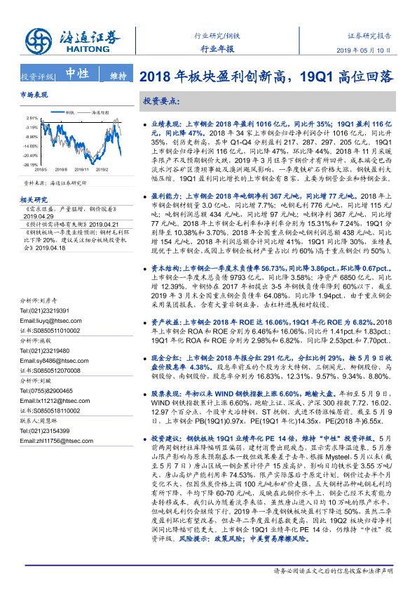 【海通证券】【20190510】20190510-海通证券-钢铁行业年报:2018年板块盈利创新高,19Q1高位回落-18页