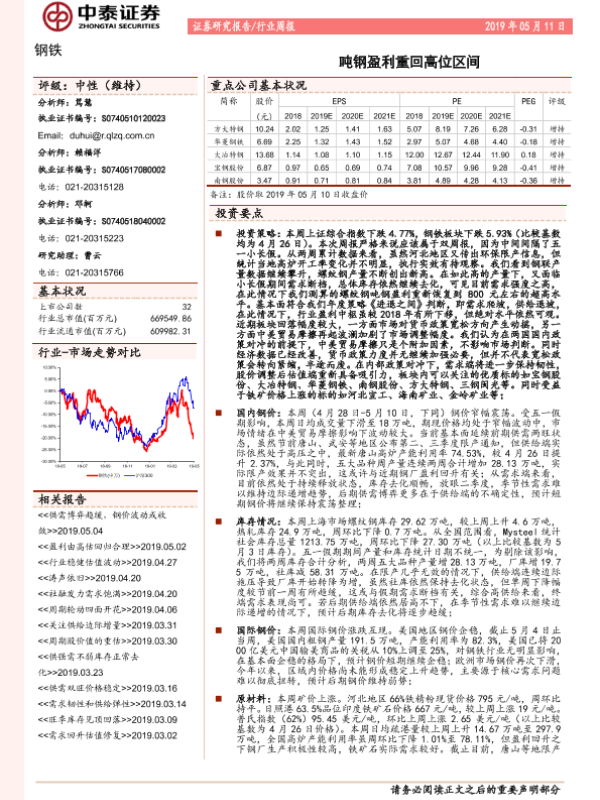 【中泰证券】【20190511】20190511-中泰证券-钢铁行业周报:吨钢盈利重回高位区间-15页