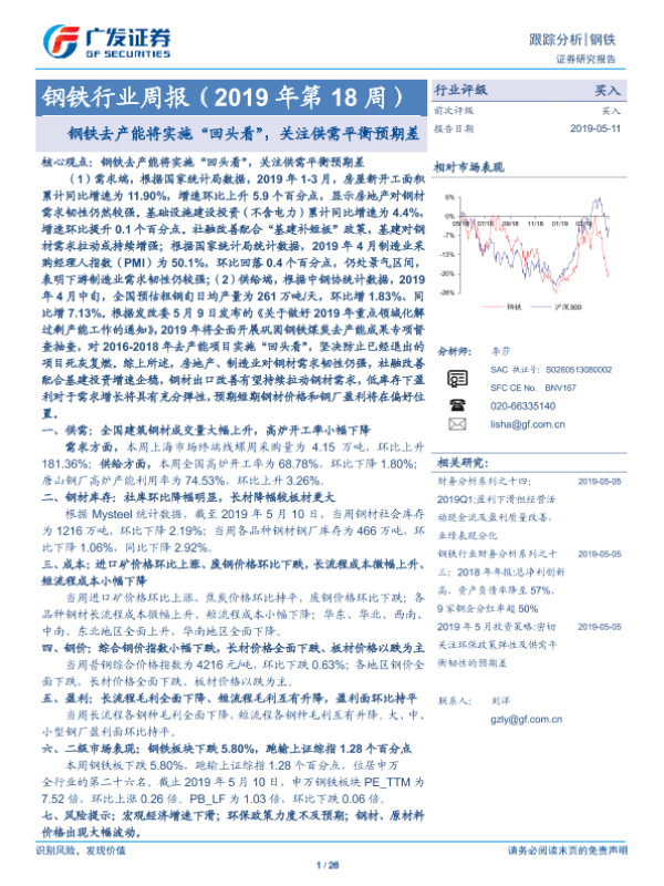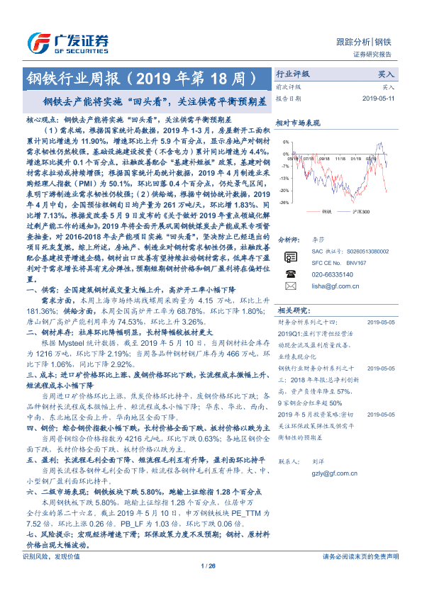 【广发证券】【20190511】钢铁行业周报(2019年第18周):钢铁去产能将实施“回头看”,关注供需平衡预期差-26页