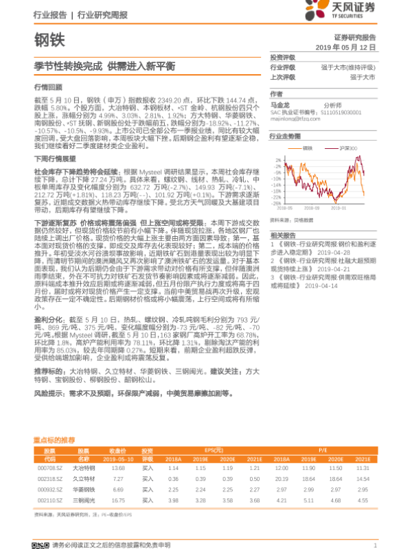 【天风证券】【20190512】20190512-天风证券-钢铁行业研究周报:季节性转换完成 供需进入新平衡-14页