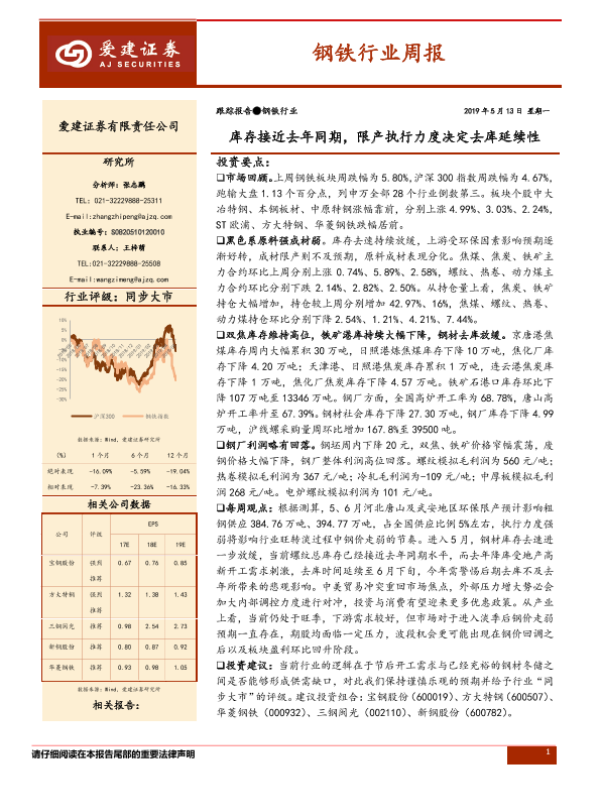 【爱建证券】【20190513】20190513-爱建证券-钢铁行业周报:库存接近去年同期,限产执行力度决定去库延续性-23页
