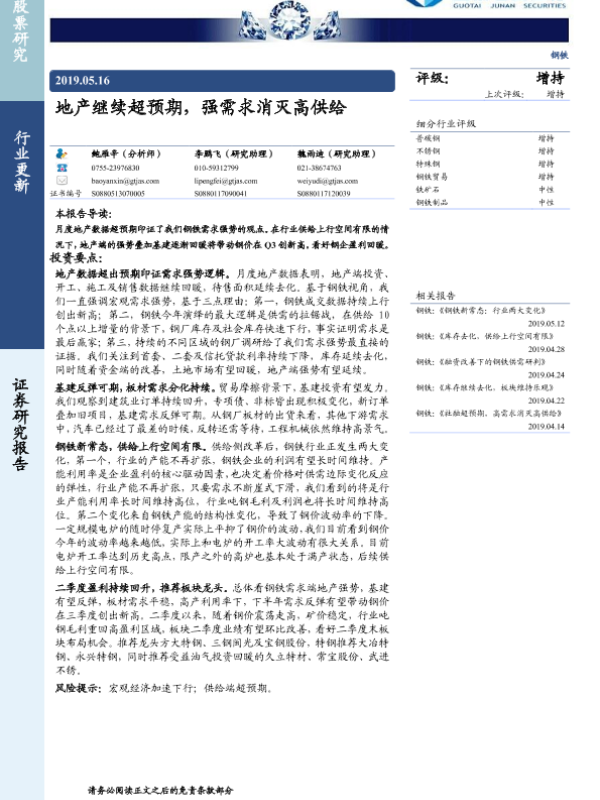 【国泰君安证券】【20190516】20190516-国泰君安-钢铁行业更新:地产继续超预期,强需求消灭高供给-3页