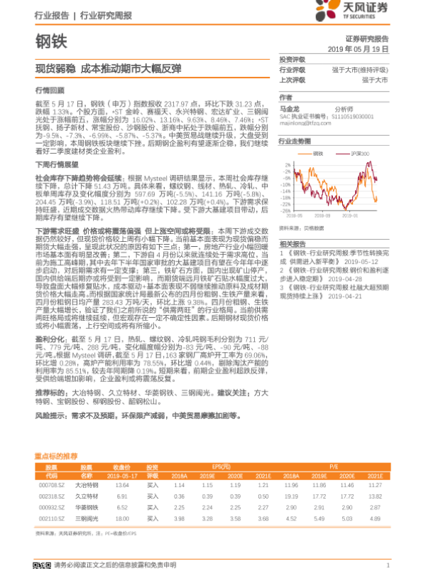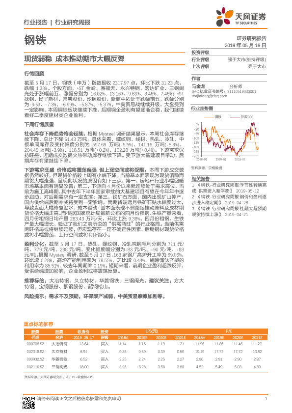 【天风证券】【20190519】20190519-天风证券-钢铁行业研究周报:现货弱稳 成本推动期市大幅反弹-14页