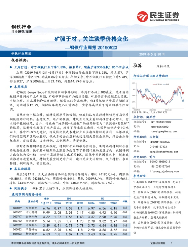 【民生证券】【20190520】20190520-民生证券-钢铁行业周报:矿强于材,关注淡季价格变化-29页