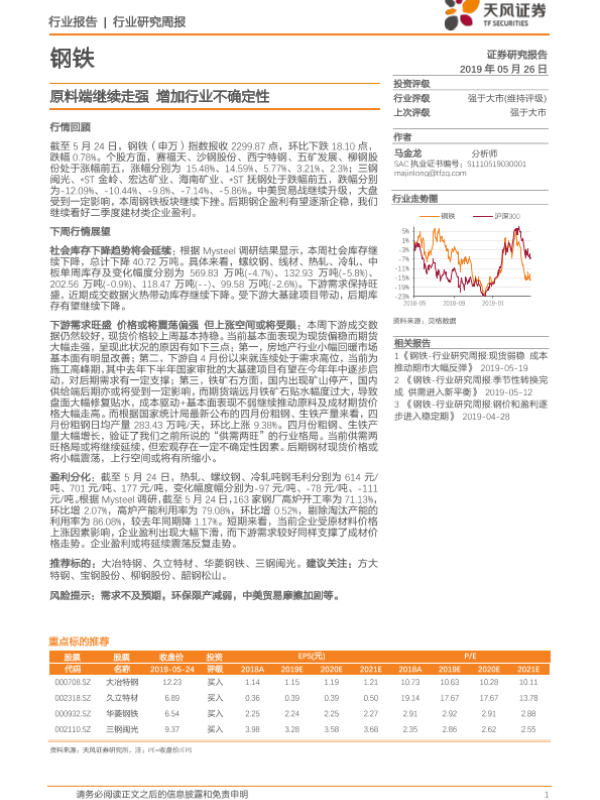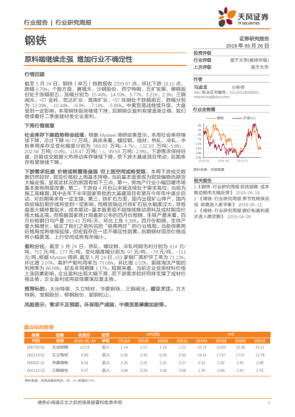 【天风证券】【20190526】20190526-天风证券-钢铁行业研究周报:原料端继续走强 增加行业不确定性-13页