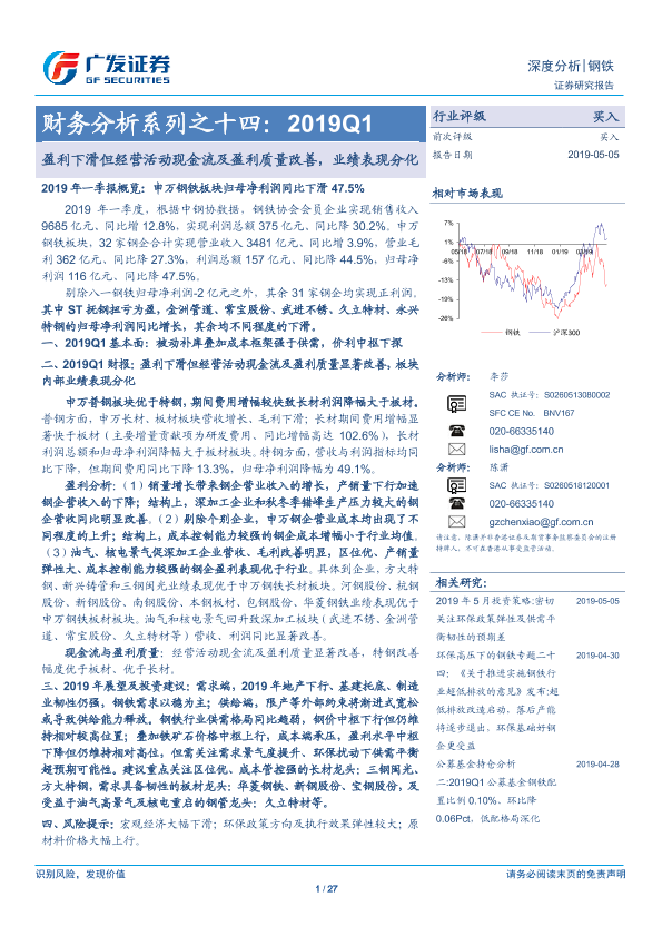 【广发证券】【20190505】2019Q1-盈利下滑但经营活动现金流及盈利质量改善,业绩表现分化-27页