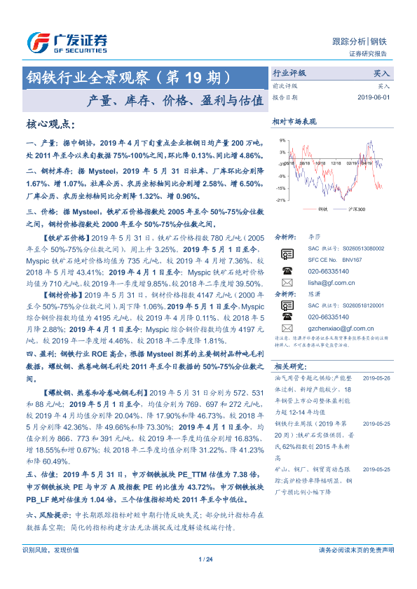 【广发证券】【20190601】20190601-广发证券-钢铁行业全景观察(第19期):产量、库存、价格、盈利与估值-24页