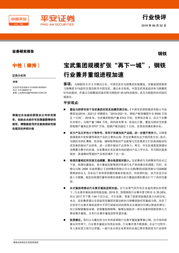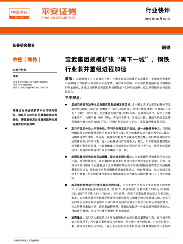 【平安证券】【20190602】钢铁:宝武集团规模扩张“再下一城”,钢铁行业兼并重组进程加速-3页