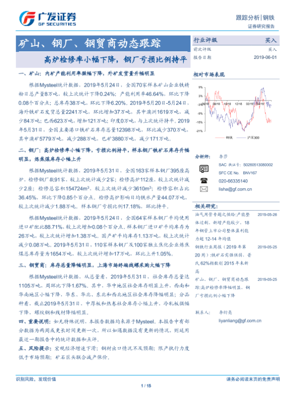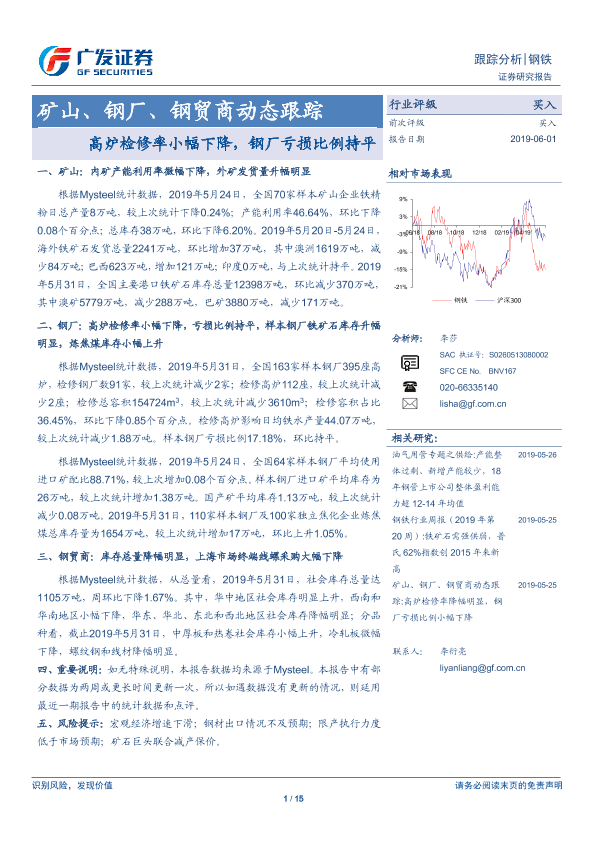 【广发证券】【20190601】矿山、钢厂、钢贸商动态跟踪:高炉检修率小幅下降,钢厂亏损比例持平-15页