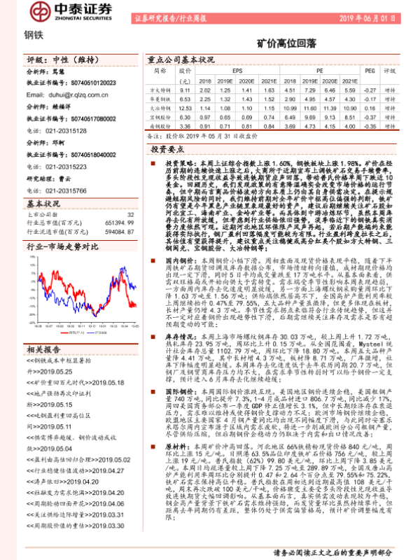 【中泰证券】【20190601】20190601-中泰证券-钢铁行业周报:矿价高位回落-15页