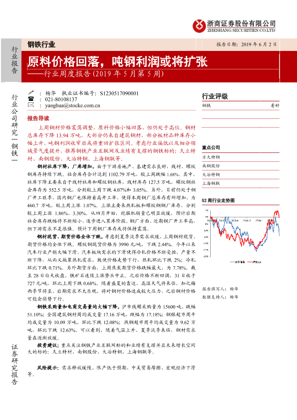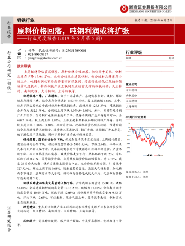 【浙商证券】【20190602】20190602-浙商证券-钢铁行业周度报告(2019年5月第5周):原料价格回落,吨钢利润或将扩张-16页