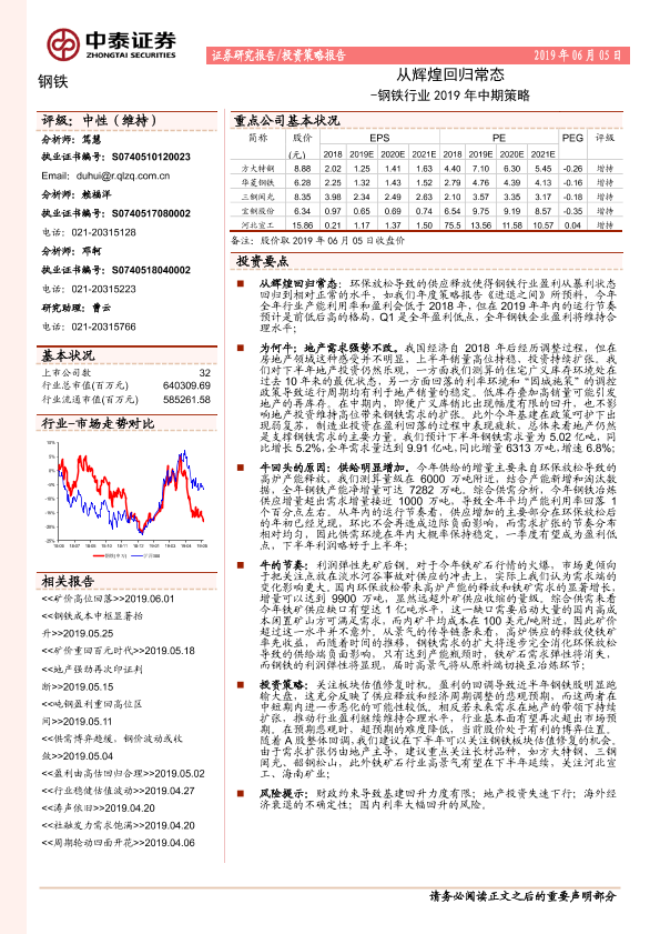 【中泰证券】【20190605】钢铁行业2019年中期策略:从辉煌回归常态-20页