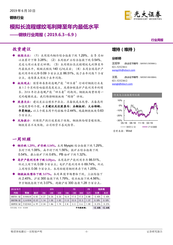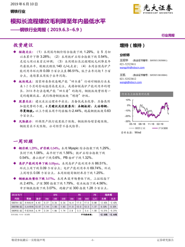 【光大证券】【20190610】20190610-光大证券-钢铁行业周报:模拟长流程螺纹毛利降至年内最低水平-9页