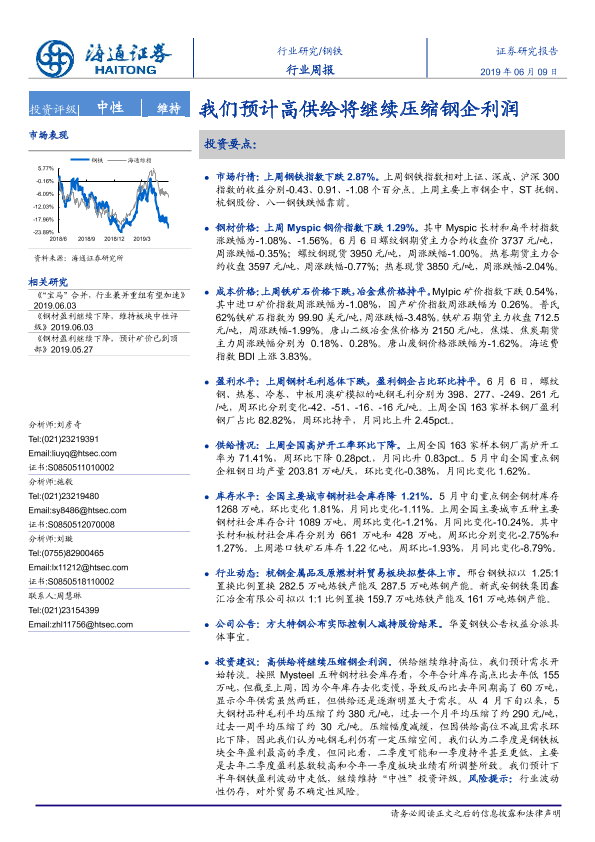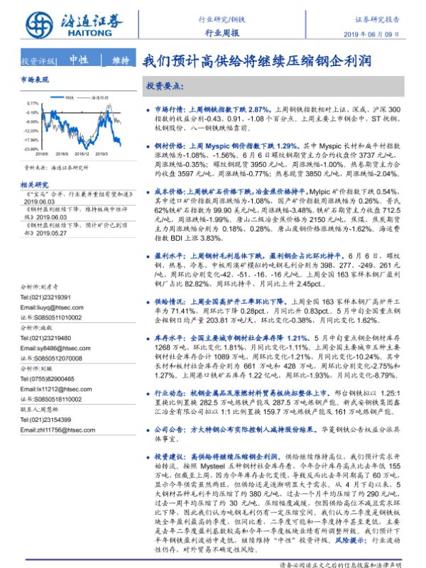【海通证券】【20190609】20190609-海通证券-钢铁行业周报:我们预计高供给将继续压缩钢企利润-14页