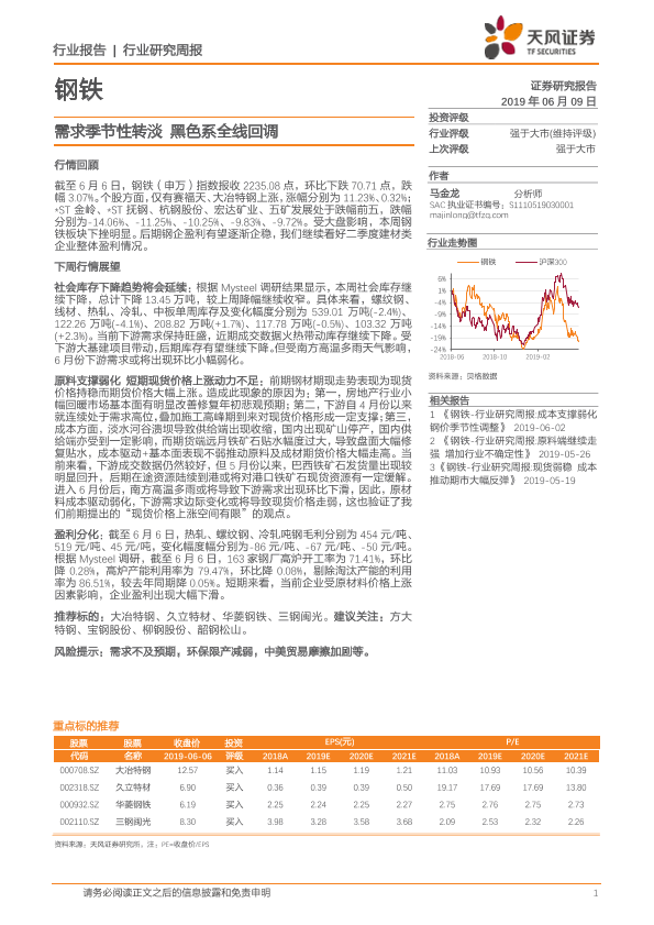 【天风证券】【20190609】20190609-天风证券-钢铁行业研究周报:需求季节性转淡 黑色系全线回调-12页