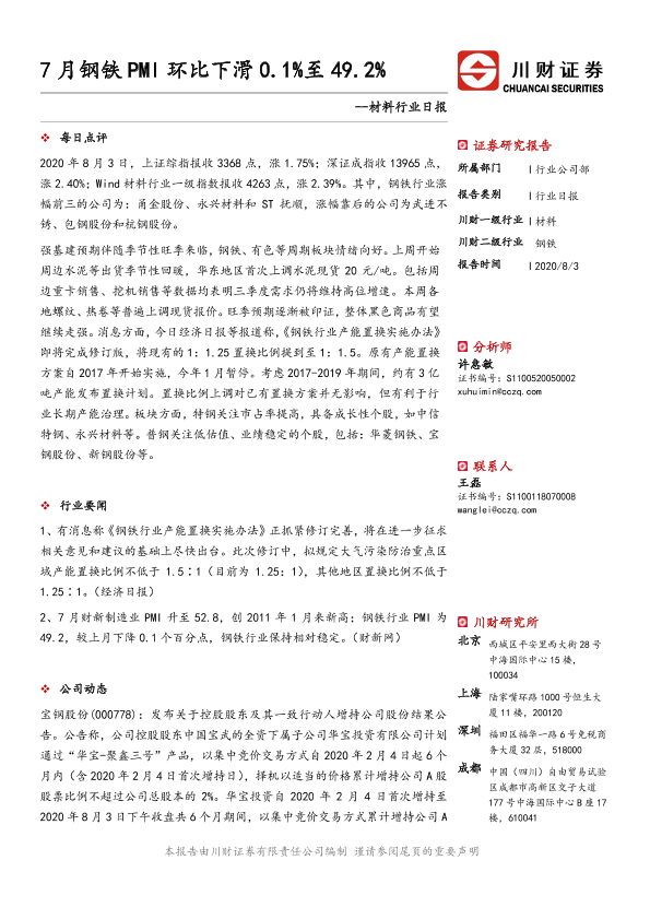 【川财证券】【20200803】材料行业日报:7月钢铁PMI环比下滑0.1%至49.2%-3页